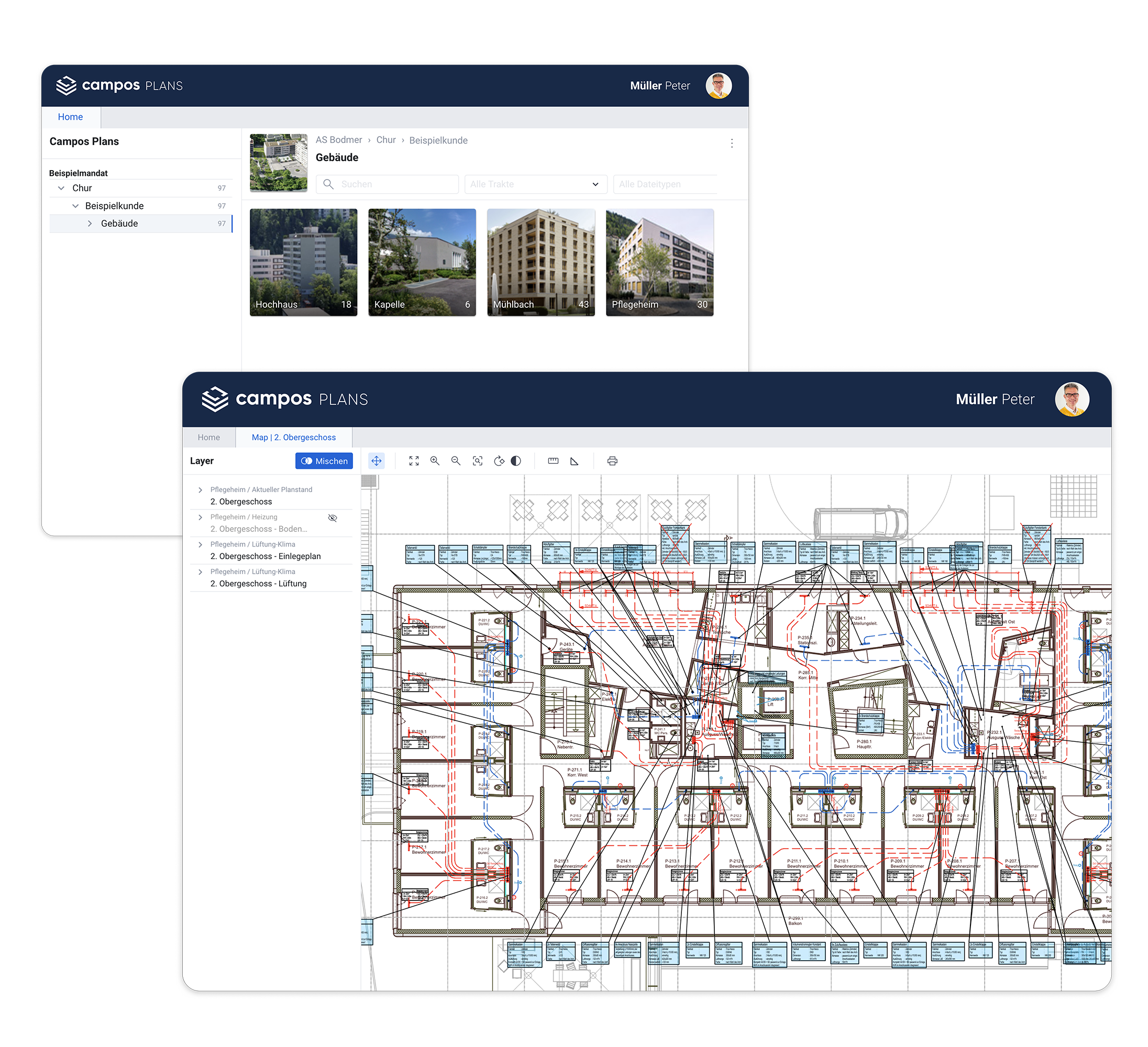 Institutionen und Unternehmen mit vielfältigen Gebäuden, Anlagen und Sicherheitsanforderungen brauchen eine zuverlässige Grundlage für Planung, Betrieb und Weiterentwicklung ihrer Infrastruktur. Campos Plans stellt Pläne und technische Unterlagen zentral, sicher und jederzeit im Webbrowser bereit. So werden Sanierungen, Wartung, Bewilligungen und Investitionsentscheide effizient unterstützt – über den gesamten Lebenszyklus hinweg.